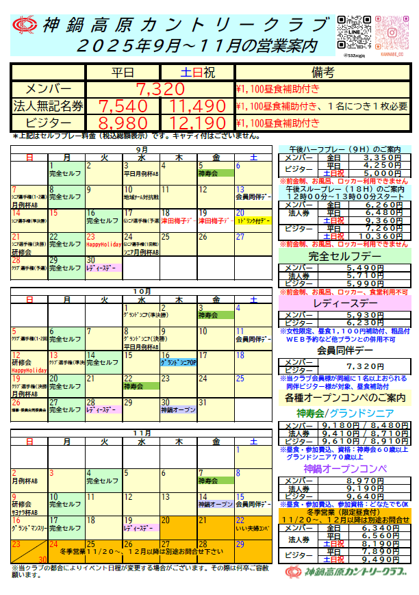 | メンバー | レンタルクラブ(1セット) | 2,000 | レンタルシューズ(1足) | 500 | 練習場コイン | 400 | 法 人 | レンタルクラブ(1セット) | 2,000 | レンタルシューズ(1足) | 500 | 練習場コイン | 400 | ビジター | レンタルクラブ(1セット) | 2,000 | レンタルシューズ(1足) | 500 | 練習場コイン | 400 |