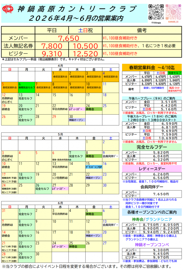 | メンバー | レンタルクラブ(1セット) | 2,000 | レンタルシューズ(1足) | 500 | 練習場コイン | 400 | 法 人 | レンタルクラブ(1セット) | 2,000 | レンタルシューズ(1足) | 500 | 練習場コイン | 400 | ビジター | レンタルクラブ(1セット) | 2,000 | レンタルシューズ(1足) | 500 | 練習場コイン | 400 |